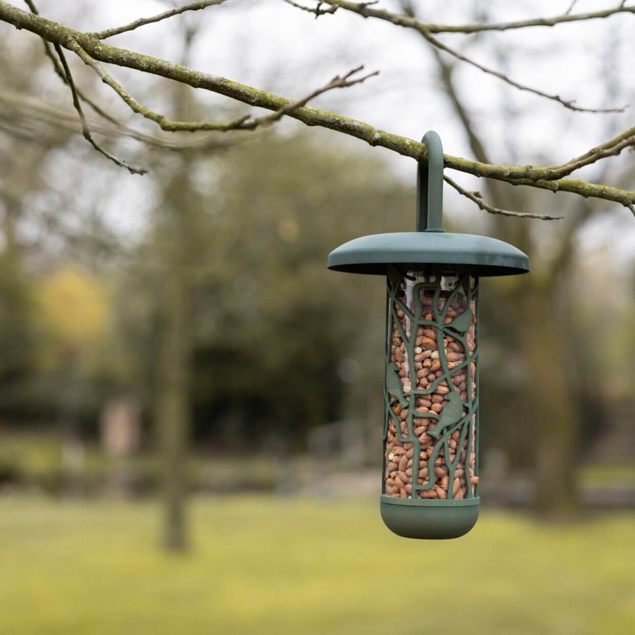 Deze duurzame voersilo voor noten, is vervaardigd van gerecyclede materialen. Perfect voor het voeren van vogels zoals mezen en roodborstjes. Gemakkelijk op te hangen en bij te vullen, en een milieuvriendelijke keuze voor elke tuin.