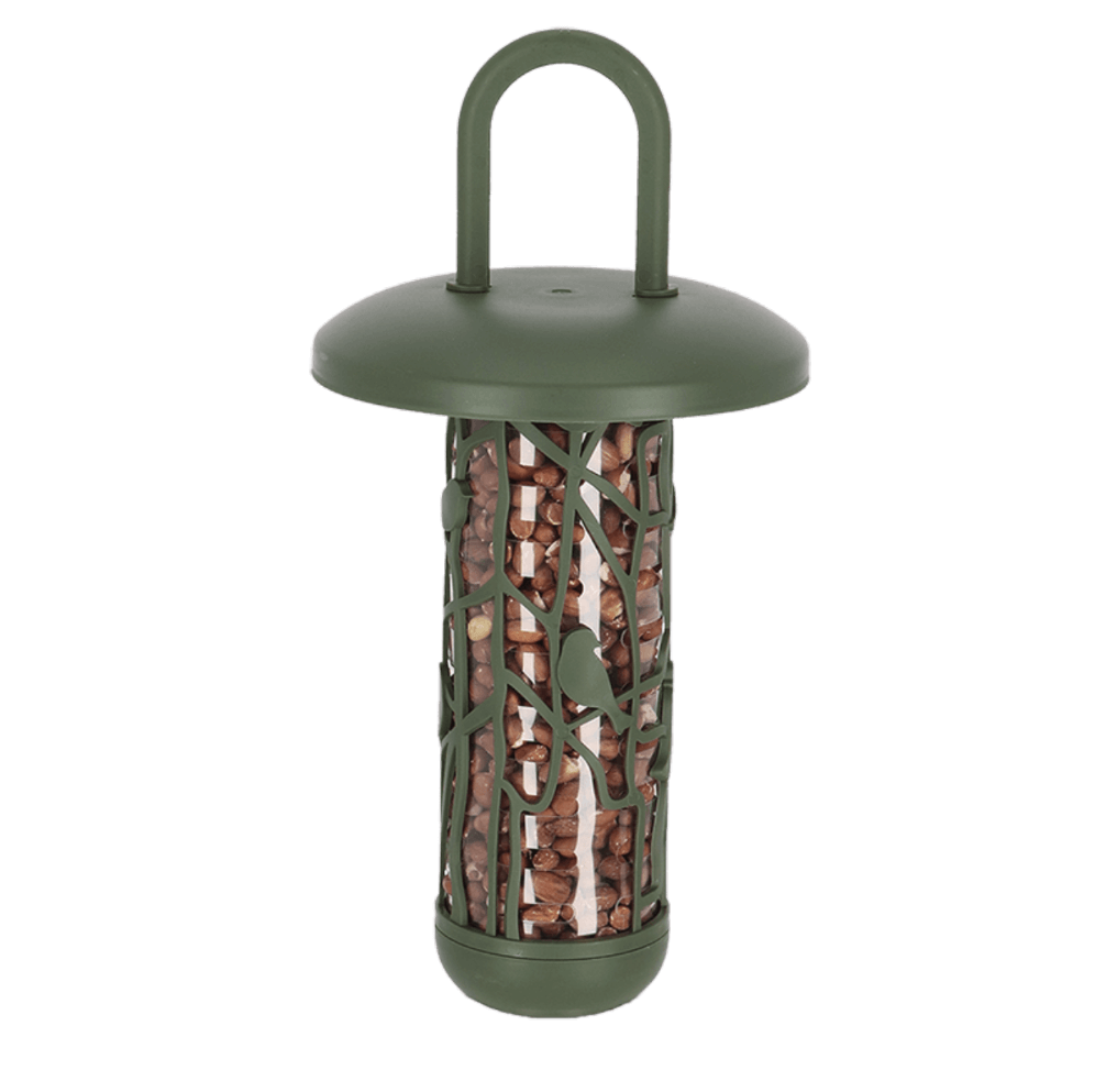 De gerecyclede notensilo van Esschert Design combineert functionaliteit en duurzaamheid in één. Deze voersilo is gemaakt van gerecyclede materialen, wat bijdraagt aan een milieuvriendelijke tuin. Het ontwerp is speciaal afgestemd op het veilig aanbieden van pinda’s en andere noten aan tuinvogels zoals mezen, spechten en boomklevers. De robuuste draadstructuur zorgt ervoor dat vogels gemakkelijk toegang hebben tot het voer, terwijl afval wordt geminimaliseerd.